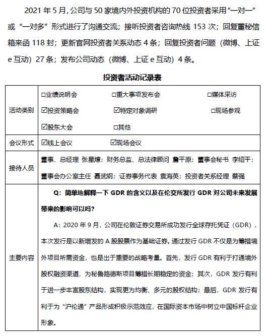 2021年5月投资者沟通情况通报