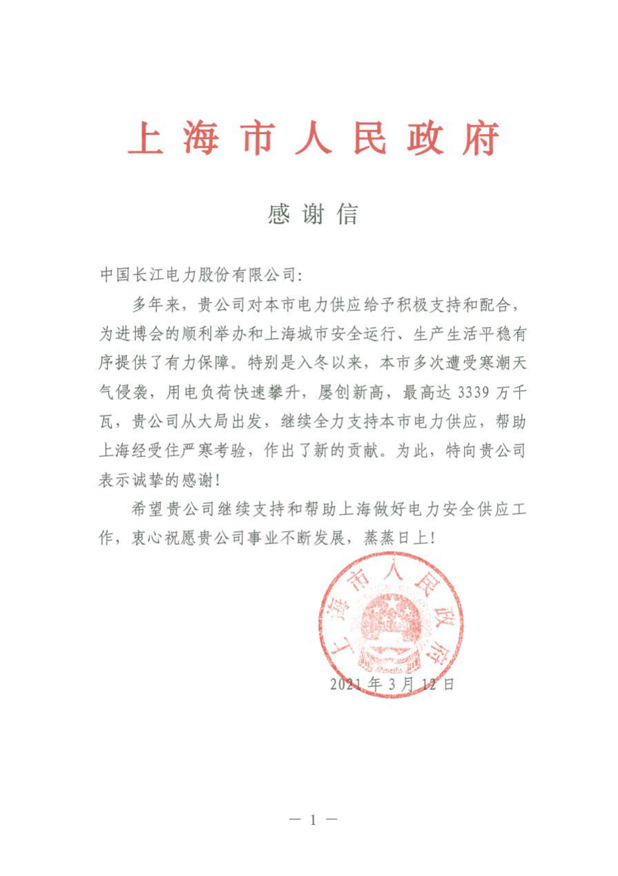 近日,继1月上海市经济和信息化委员会发来感谢信后,长江电力再次收到来自上海市人民政府发来的感谢信,感谢长江电力为上海市电力供应给予的积极支持和配合,助力上海经受住严寒考验,为进博会的顺利举办和上海市城市安全运行、生活平稳有序提供了有力保障。