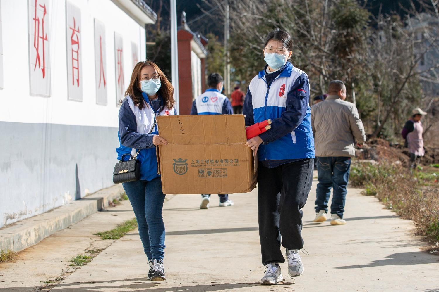 志愿者搬运物资(拍摄:梁峰)