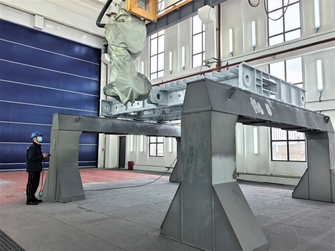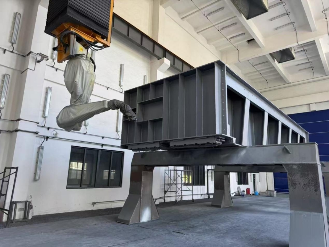 确定了方向,团队先后赴多家船舶制造厂、金属结构防腐厂开展实地调研,重点了解不同类型喷涂机器人的结构形式、运动方式、轨迹控制能力、喷枪适配性能以及在复杂钢结构表面作业中的实际表现,对比分析了多种方案在作业范围、灵活性、工艺成熟度和改造潜力等方面的差异。经过反复论证,项目团队决定引入船舶通用喷涂机器人。