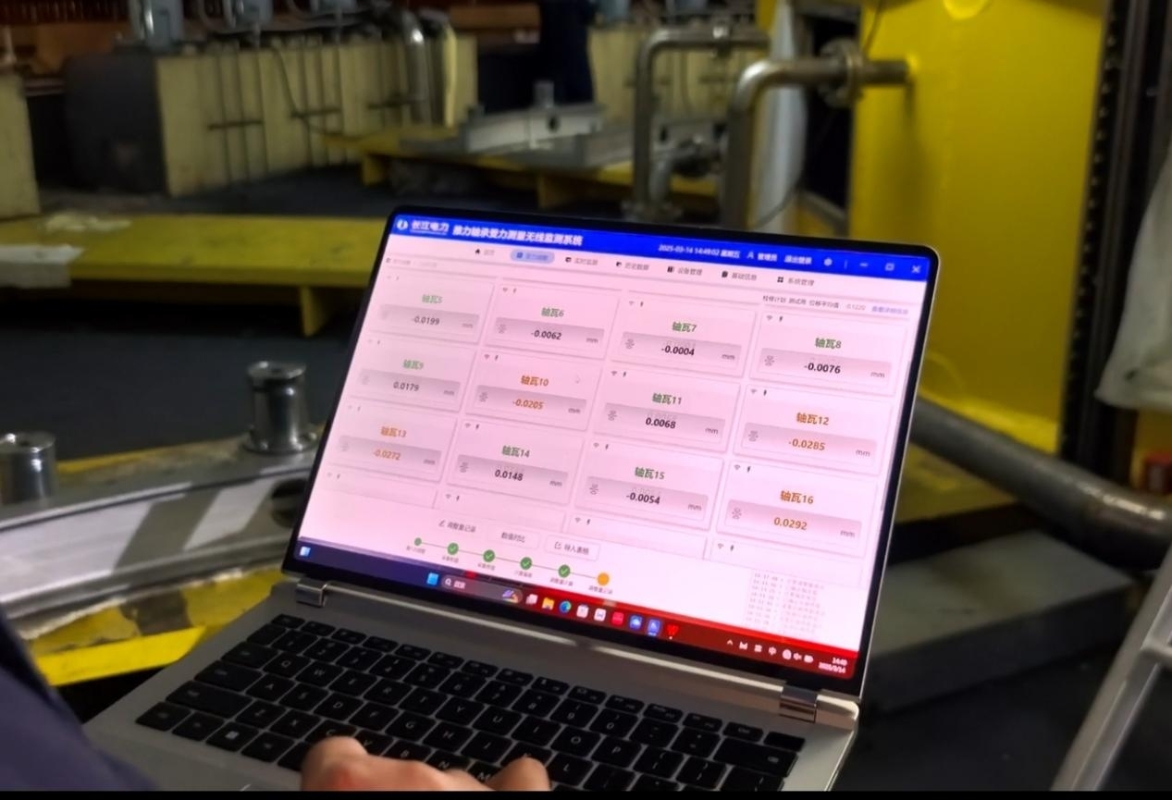 每一块推力瓦的支柱螺栓,被装上高精度位移传感器——就像做心电图时贴上电极片,能实时捕捉每一丝受力变化。同时低功耗无线传输技术摆脱有线连接的束缚,瞬间收集几百个数据并输入后台。一个巴掌大的无线采集终端,像监测系统的“大脑”,快速识别、处理数据,并可视化展现。