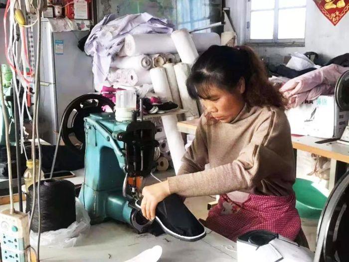 鞋厂工人大多都是像高玉兰和张坤这样家庭贫困的妇女。“厂里只要有活儿,都优先给家里最困难的人做。”鞋厂老板杜青霞说。