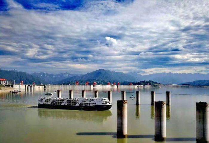 2019年8月,盛夏时节,在蓝天白云和一江碧水的拥抱下,一艘船舶“乘坐”三峡升船机,从上游面下降到下游面后,平稳驶出下游引航道。 摄影:汤伟