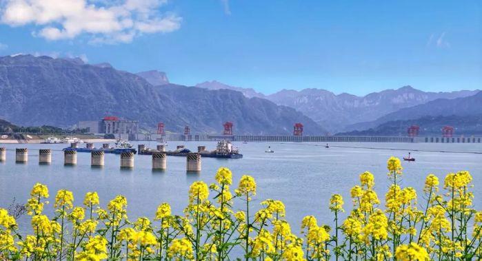 2019年3月,三峡升船机上游面的油菜花绽放出灿烂花朵,几艘船舶行驶在平静的江面上,高峡平湖美不胜收。 摄影:朱静霞