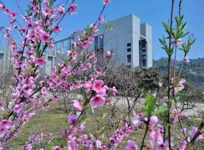 2019年3月,三峡升船机旁的桃花纷纷盛开,给庄严矗立的三峡升船机带去一抹动人的艳丽。 摄影:汤伟