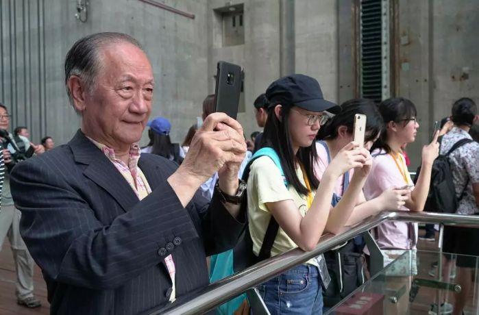 2019年8月8日,新党主席郁慕明(左一),率领中华儿女文史体验营的20余名中国台湾地区学生,参观三峡工程,在三峡升船机上留影。 摄影:朱静霞