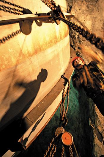 图为一名起重工正对压力钢管进行下滑前的施工准备。为使三峡右岸地下电站压力钢管顺利下滑,承担施工任务的葛洲坝机电公司通航工程设备安装处的起重工们,克服作业面狭窄等诸多困难,精益求精,正在3号斜井入口处用导链对压力钢管与下滑台车进行认真捆绑。本报记者 孙荣刚 摄