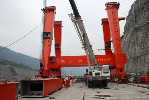 启闭机是整个进水塔拦污栅、检修门等吊装启闭的核心设备。溪洛渡右岸进水塔塔顶共设置两台2500千牛∕500千牛双向门式启闭机,每台启闭机轨宽14.8米,高31.87米,自重36.49吨。由中国水电建设集团公司夹江水工机械厂制造,水电十四局安装,两台门机安装计划于今年底完成。