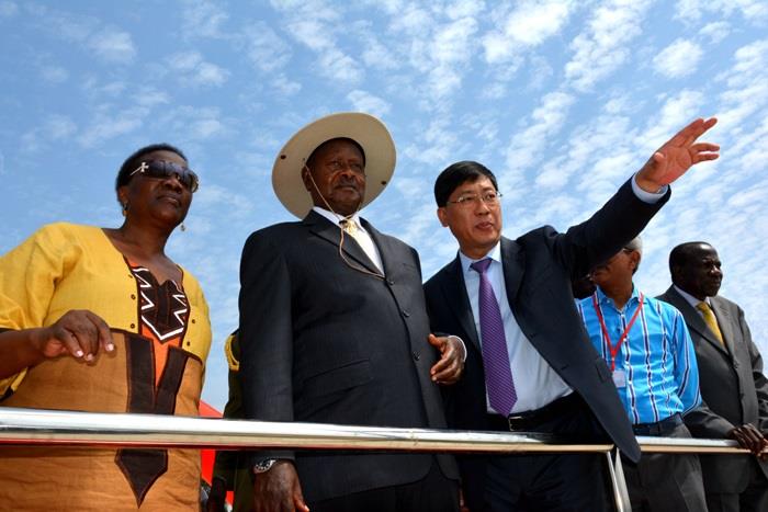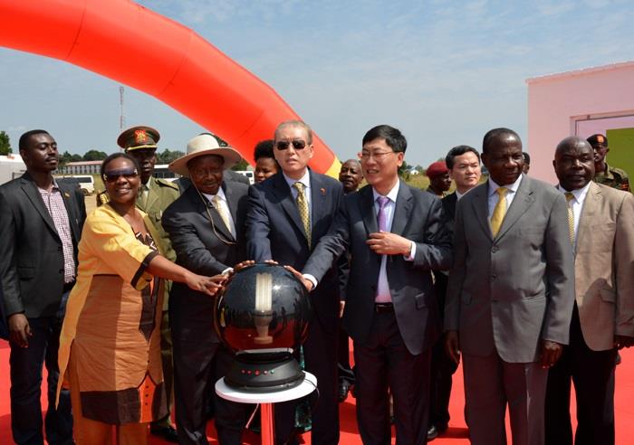 乌干达总统穆塞维尼、中国驻乌干达大使赵亚力、乌干达能矿部部长艾琳和中水电公司王禹总经理一道启动水晶球。