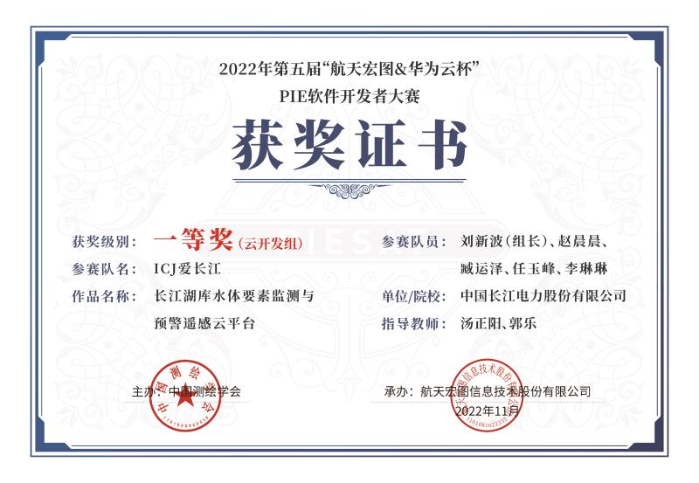 本网讯(马一鸣 刘新波)近日,由中国测绘学会主办的第五届“航天宏图&华为云杯”PIE软件开发者大赛落下帷幕。经过近五个月的激烈角逐,三峡集团长江电力自研项目“长江湖库水体要素监测与预警遥感云平台”斩获一等奖。