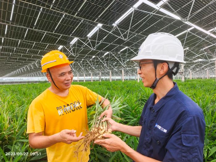 惠东润佳项目位于广东省惠州市惠东县境内,秉持“农光互补、以农为先、向阳绿电、富农为主”的绿色可持续发展理念,项目团队与当地的农业合作社、科技公司协同合作,开展了无土栽培“绿色蔬菜”、黄姜类和罗汉果等多品类的种植示范试验工作,成功实践了“柔性支架/固定支架+板下无土栽培”和“育苗车间+植物工厂”的农光创新融合模式,在供给绿色电力的同时,也为大湾区提供高品质的绿色蔬菜。