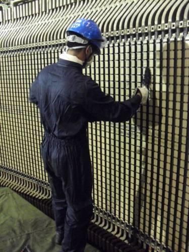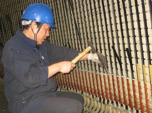 退出全部旧槽楔,清洗完槽底检查无异常后,则可以进行槽楔重打的主体工程——打槽楔。要想把槽楔打紧,必须有槽楔、斜楔和半导体垫条,只有半导体垫条垫得厚薄适合,才能将斜楔打进去。过紧,斜楔则打不进去,下端空;过松,垫条不够,当然也会不紧,几种规格的垫条只有反复试验方才合适。打槽楔时平均打紧一节槽楔需要使尽全身力气抡榔头的次数约为10次,那么打完所有槽楔需得抡榔头的次数:756×10×10=75600次。