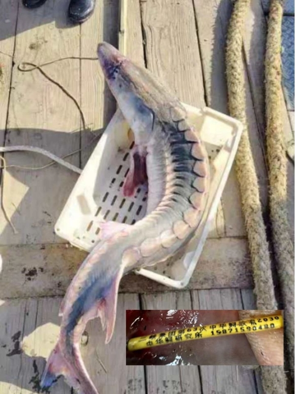 ▲ 江苏海门水域误捕的中华鲟及其背鳍上的T型标记(江苏省南通市环保监测中心供图)