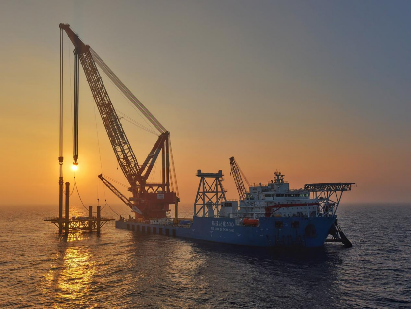 ▲ 起重船“电建志高”进行钢管桩沉桩