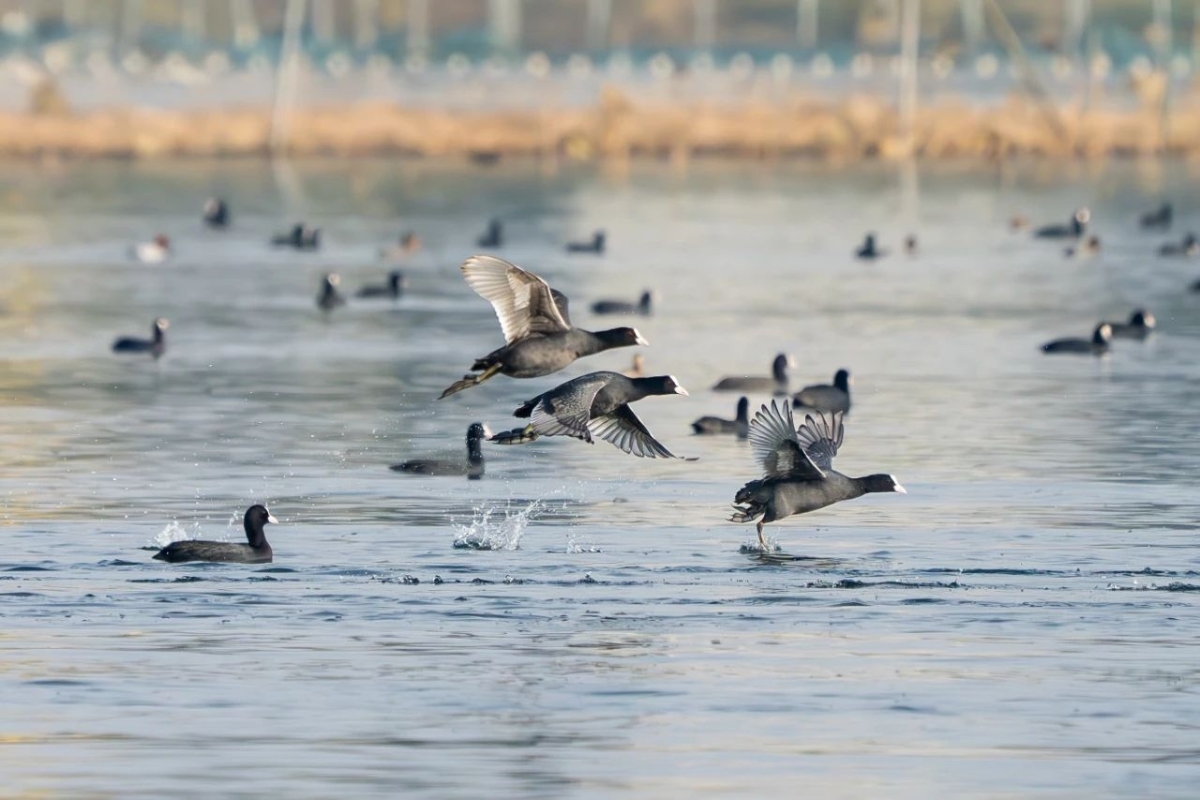 ▲ 红旗湖上白骨顶正在踩水掠波 摄影:胡九思