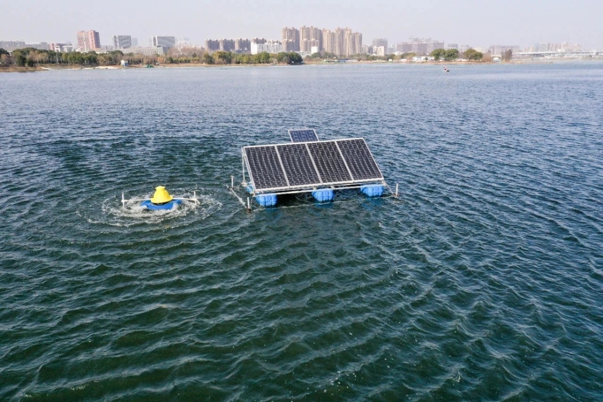 如今,无人机视角下,从巨型“花朵”向远处看去,自北向南逐渐扩宽的湖面上,由近及远横亘着数条堤埂,反射出一排排亮点,1700多个膜组件形成的超强“膜”力正在去除处理水体中的污染物;戴“小黄帽”的“蓝胖子”在旁边光伏板的助力下“转圈圈”,光伏涌浪机正在利用浮体叶轮叶片推水形成浪花提升水体流动性,对水体曝气增氧,助力水体净化。