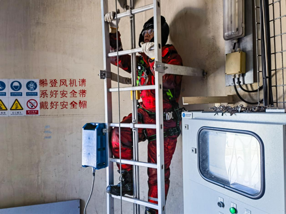 “这台风机高70米,需要我们借助助爬器爬上去。冬季山上的平均气温都在零下25摄氏度左右,最冷可以达到零下30多摄氏度。这么冷的天气有可能让助爬器电机润滑油凝固,助爬器如果不好用,就得靠自己爬上去。”林立昆一边穿安全护具一边说。